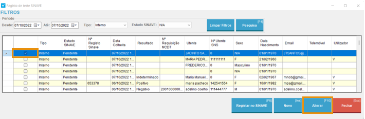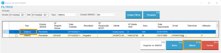 Para o efeito aceda ao Mapa Registo de Teste SINAVE, disponível no menu Produtos> Registo de Teste SINAVE, selecione o registo relativo à venda desejada e clique em Alterar [F10].