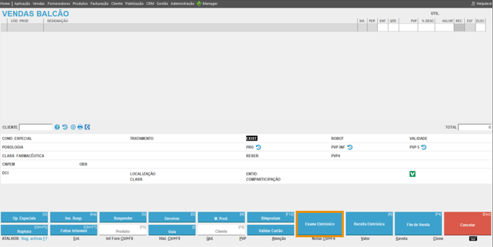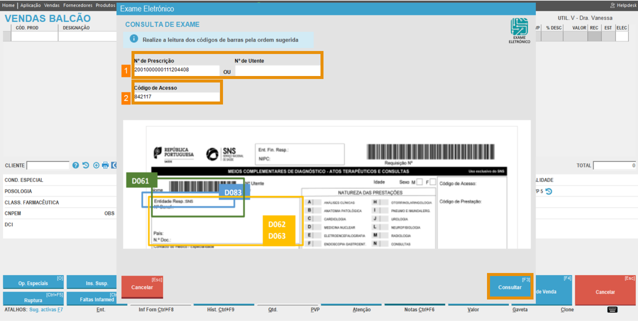 Para efetuar a consulta instantânea de um exame prescrito como MCDT, clique em [Exame Eletrónico] ao balcão.