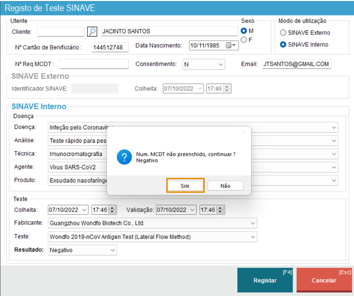 Clique em SIM para confirmar o resultado do teste registado no formulário e finalizar o registo no SINAVELab.