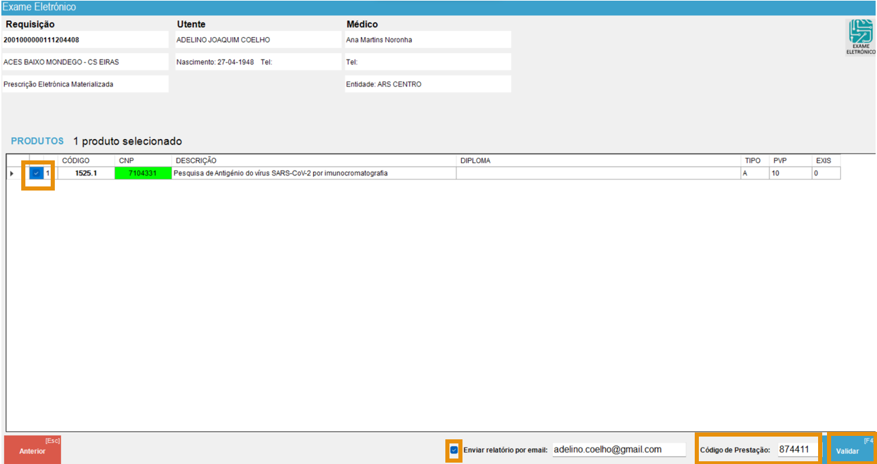 Caso deseje enviar o relatório por e-mail para o utente, selecione o campo assinalado em rodapé e preencha o campo com o endereço pretendido.