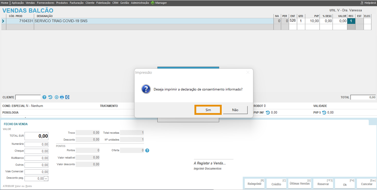 Atente ao alerta despoletado automaticamente pelo Winphar no fim da venda e clique em SIM para imprimir a Declaração de Consentimento Informado.