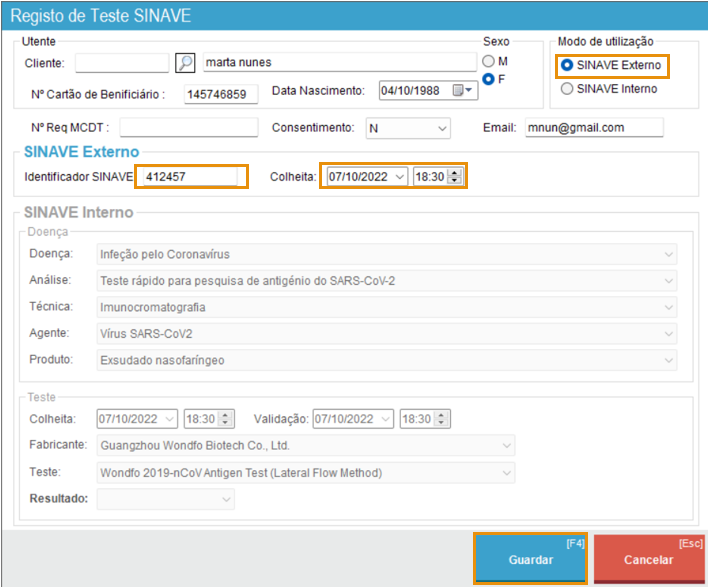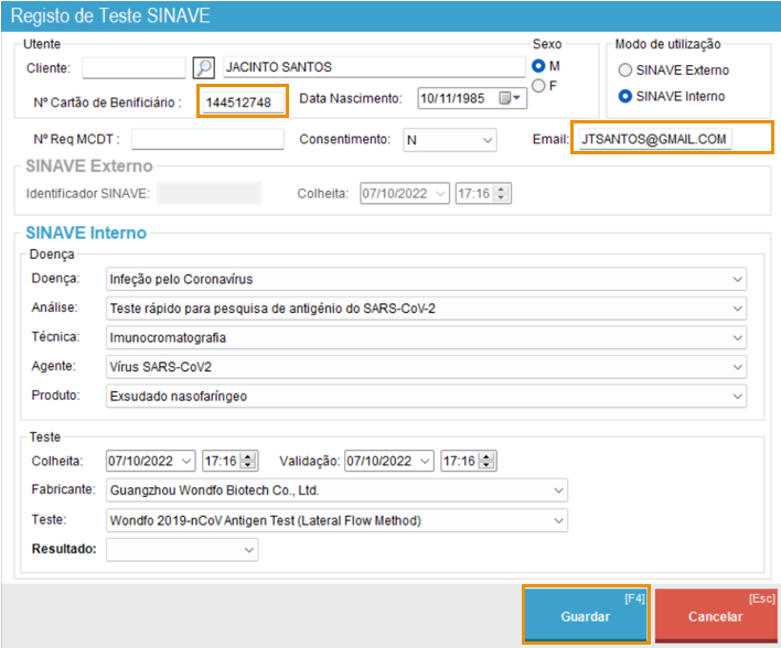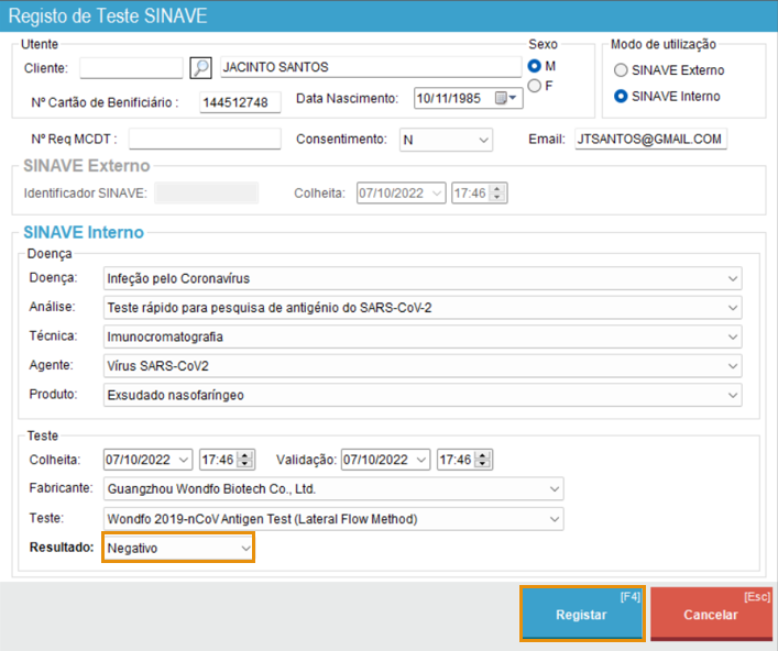 Assim que obtiver o resultado do teste e estiver em condições de comunicar o registo ao SINAVE e o resultado ao utente, selecione o registo em causa e clique em Registar no SINAVE [F5].Preencha o Resultado do teste e clique em Registar [F4] para efetuar o respetivo registo no SINAVELab.