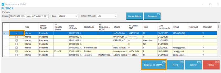 A qualquer instante poderá consultar o Mapa Registo de Teste SINAVE e verificar se existem registos no estado pendente de comunicação ao SINAVE e tratar os mesmos em conformidade.