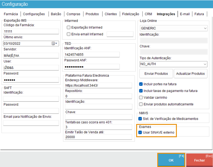 Caso a sua farmácia utilize uma plataforma externa para comunicação com o SINAVELab (ex: Plataforma ANF), deverá aceder ao menu Administração> Configuração> Integrações, colocar um visto no campo assinalado e clicar em OK [F4] para gravar as alterações efetuadas.