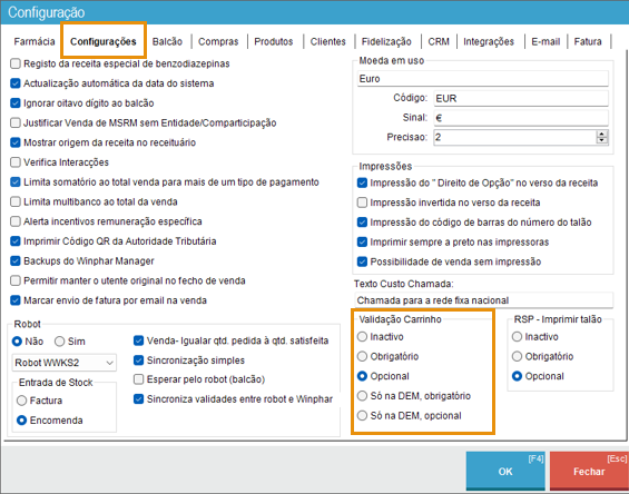 Caso a configuração esteja no estado “Inativo”, o carrinho apenas irá ser despoletado ao balcão caso exista pelo menos um medicamento abrangido pela DMF para dispensa.