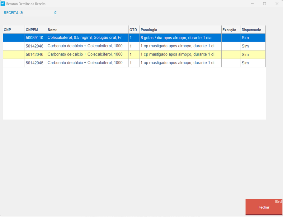 O detalhe da receita inclui: CNPEM (ou CNP) do medicamento prescrito, quantidade de embalagens, posologia eletrónica e informação sobre o estado da dispensa (se foi ou não dispensado na venda em causa).