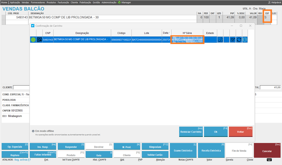 Caso a configuração esteja no estado “Obrigatório”, o carrinho irá ser despoletado em todas as vendas de produtos (exceto produtos do tipo Serviços), sendo obrigatória a verificação de todas as embalagens em dispensa (seja através da leitura do CNP dos produtos, seja através da leitura do QR Code dos medicamentos abrangidos pela DMF), não permitindo avançar sem a execução da operação.
