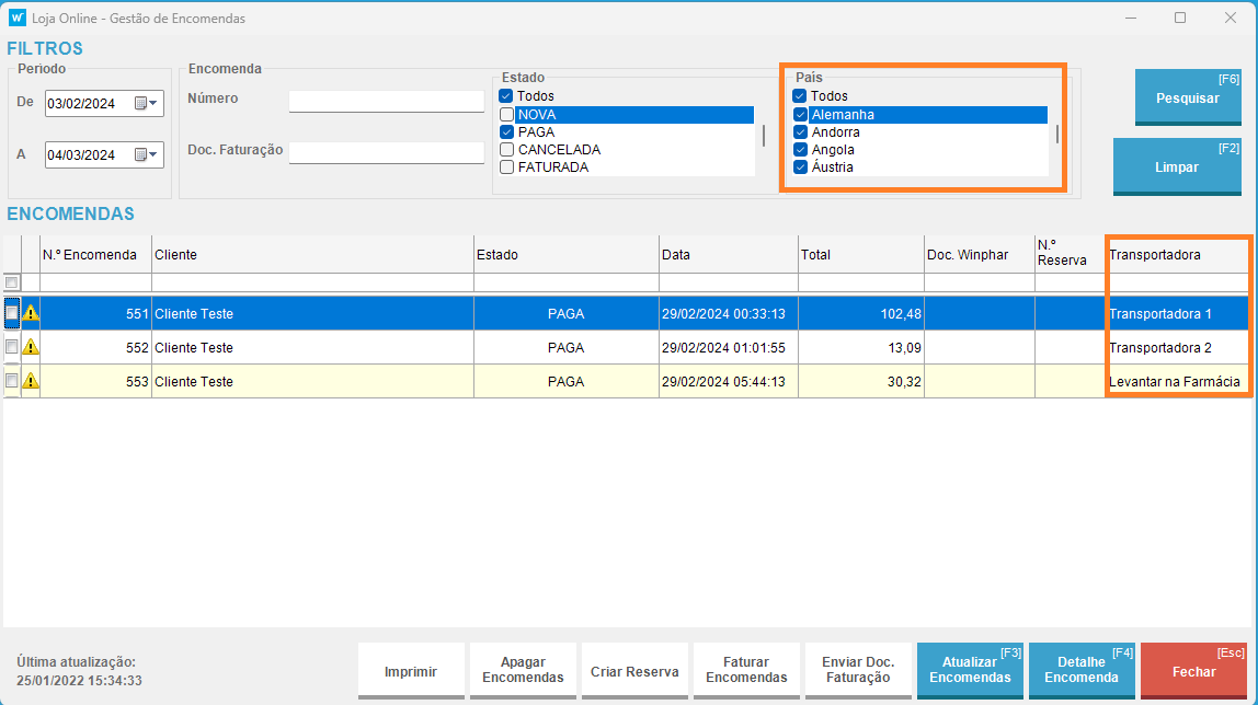 Assim, foi incluído um novo filtro País para refinar a pesquisa no formulário, bem como uma nova coluna Transportadora com informação relativa ao envio de cada Encomenda.