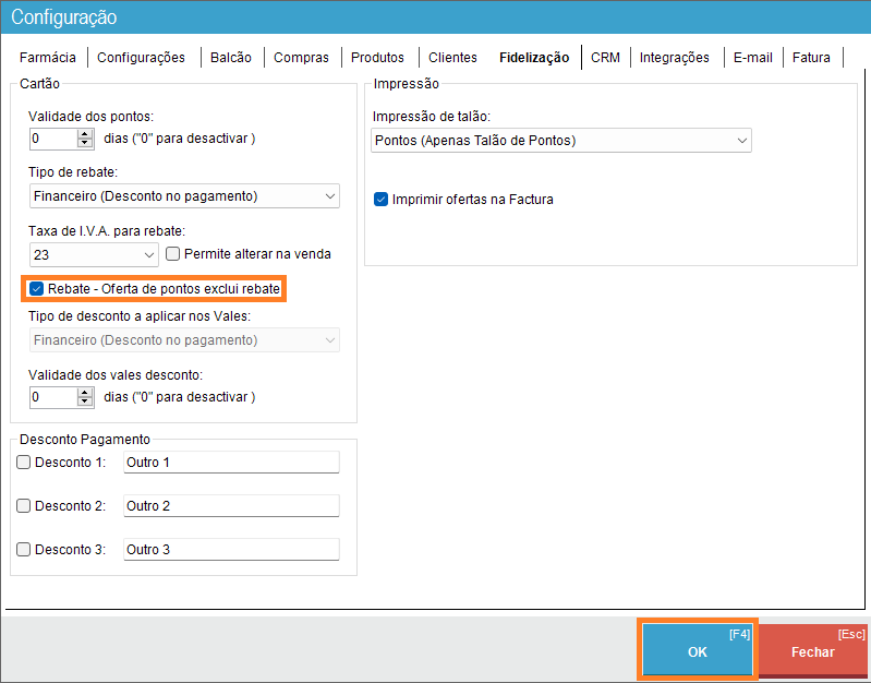A pedido de várias farmácias que utilizam o nosso módulo de Fidelização, foi criada a possibilidade de parametrizar a atribuição de pontos sobre o valor final da venda após rebate.