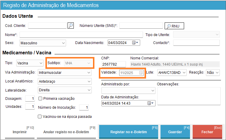 De forma a agilizar o fluxo do Registo de Administração de Medicamentos e a limitar o erro, o Winphar passou a preencher automaticamente (com base na informação disponibilizada pelos Serviços do Vacinas dos SPMS) os campos Subtipo e Validade, de acordo respetivamente com o CNP e Lote da Vacina inseridos pelo utilizador.