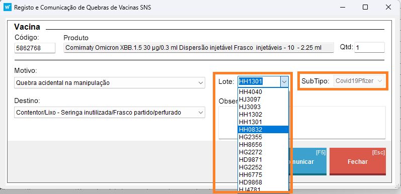 À semelhança do ponto anterior, com a mesma lógica de implementação de automatismos que limitam o erro humano e agilizam os processos, também no Registo e Comunicação de Quebras, após introdução do Código do Produto, o subtipo é automaticamente preenchido (com base na informação disponibilizada pelos Serviços do Vacinas dos SPMS) e bloqueado para edição por parte do utilizador.
