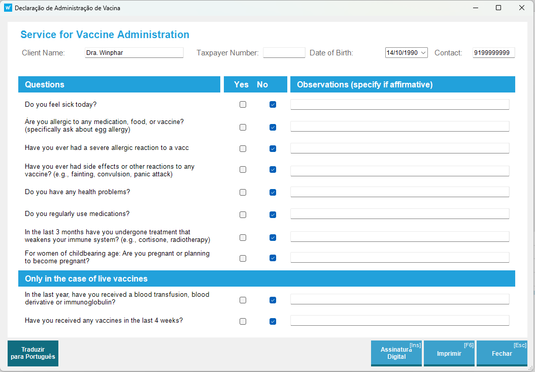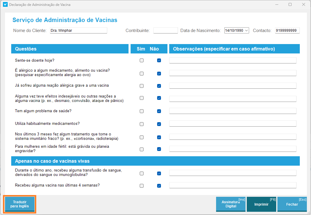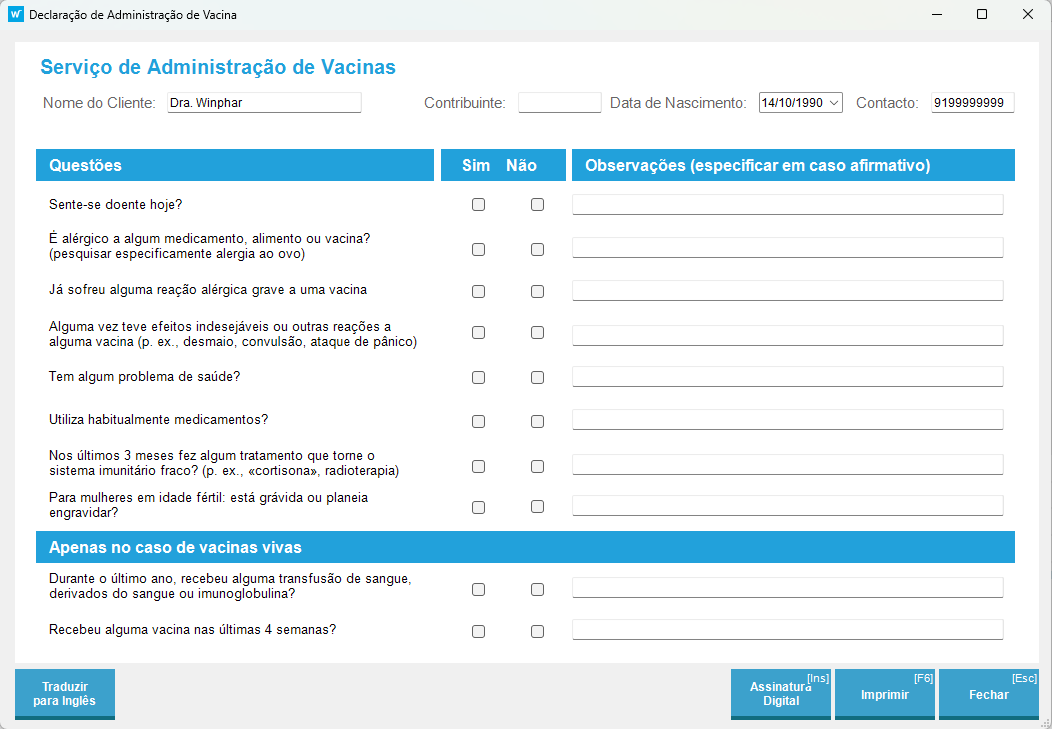 O Winphar apresenta de forma automática, tal como nas versões anteriores, a declaração de administração de Vacinas, com as questões a dirigir ao utente.